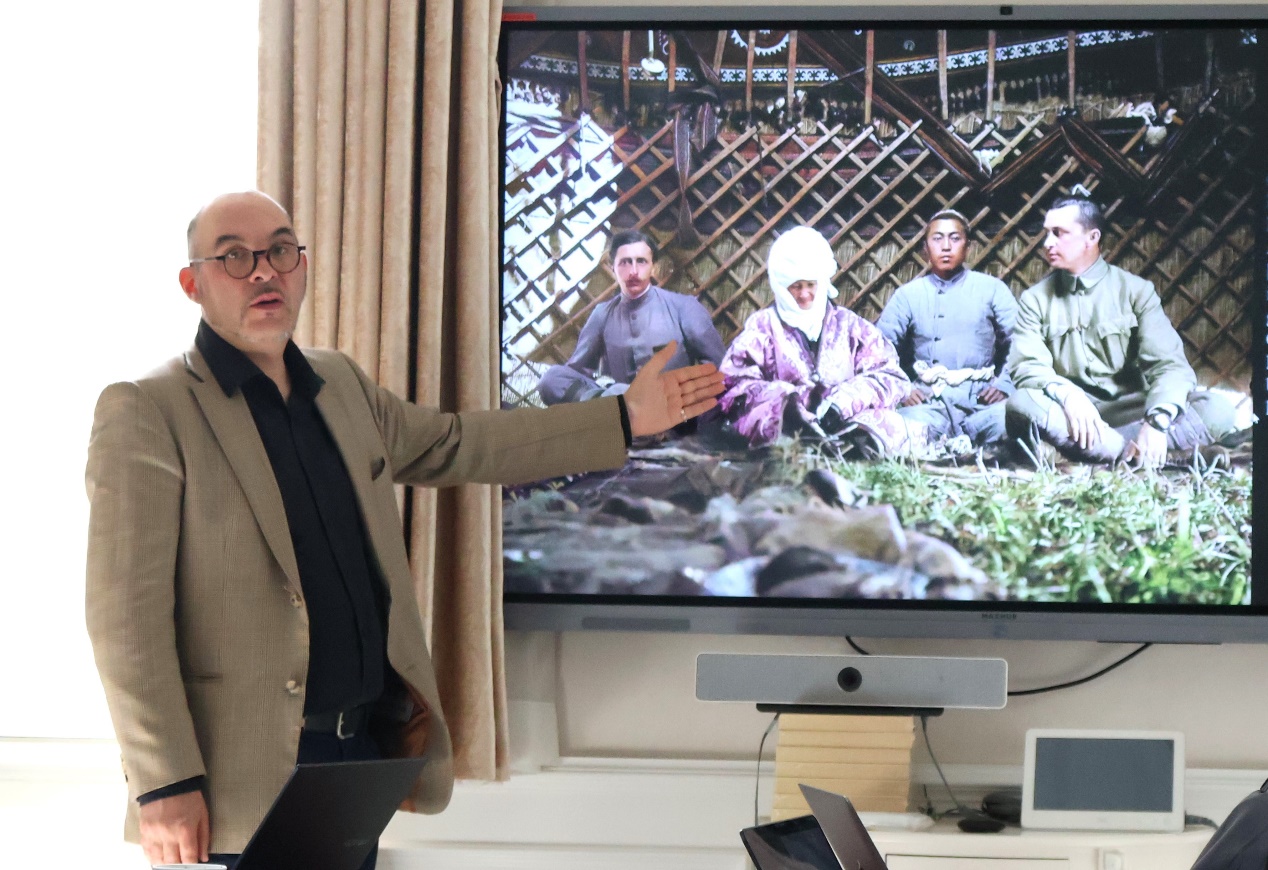 主讲人首先展示了一张法国东方学家伯希和(Paul Pelliot)、俄国陆军上校马达汉(Gustaf Mannerheim,20世纪中期出任芬兰总统)和中亚南部阿赖山区首领库尔曼江·达特卡(Kurmanjan Datka)及其孙子的合影。通过长期实地调研,主讲人意识到吉尔吉斯斯坦学界和民众对伯希和其人知之甚少。因此,他挖掘了未经出版的伯希和探险队在乌兹别克斯坦和吉尔吉斯斯坦拍摄的照片,并结合伯希和的旅行日记、信件及相关文件,试图还原伯希和科考团在中亚的鲜为人知的历史。