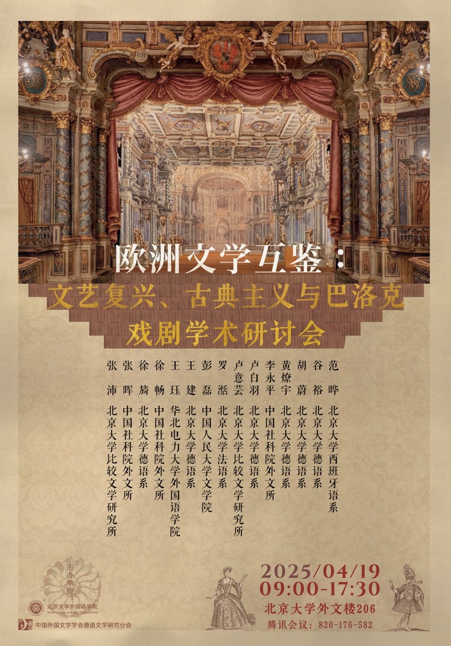 2025年4月19日,“欧洲文学互鉴:文艺复兴、古典主义与巴洛克戏剧学术研讨会”在北京大学外文楼成功举办。本次会议由中欧网页版登录入口和中国外国文学学会德语文学研究分会联合主办,吸引了来自北京大学多个院系以及中国社会科学院外国文学研究所、北京外国语大学、中国人民大学、华北电力大学等高校和科研单位的众多师生积极参与,场面热烈,反响盛大。